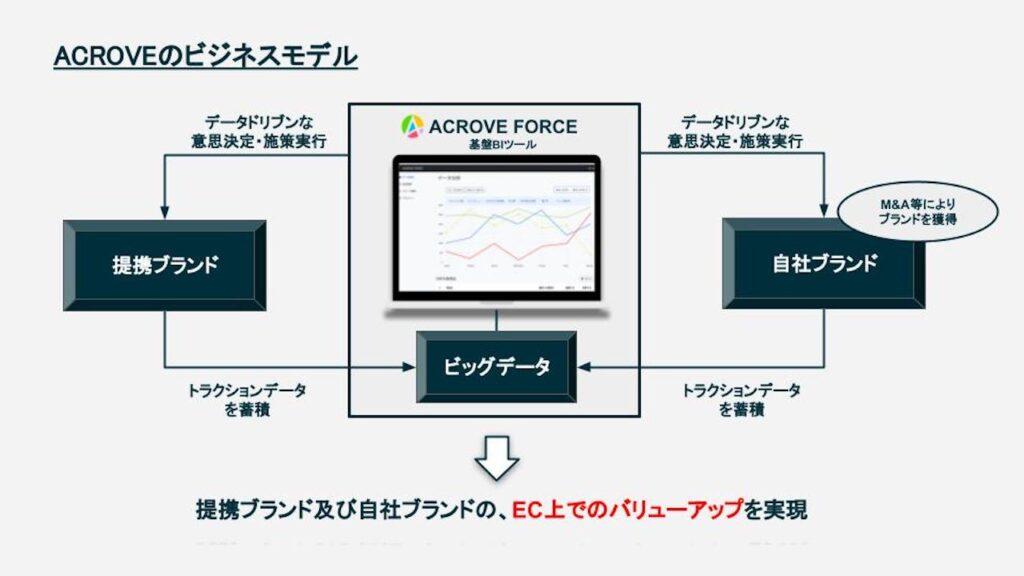 ACROVEは、独自BIツールであるACROVE FORCEによってブランドを成長させるECプラットフォーム・カンパニーです。サービスには、提携先のEC支援を行う「提携ブランド事業」、 及び買収等で獲得した自社ブランドを成長させる「自社ブランド事業」があります。